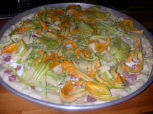 Focaccia bacon, smoked cheese, trumpets and zucchini flowers