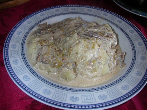Ormea blanco polenta con salsa de tomate con puerros y setas